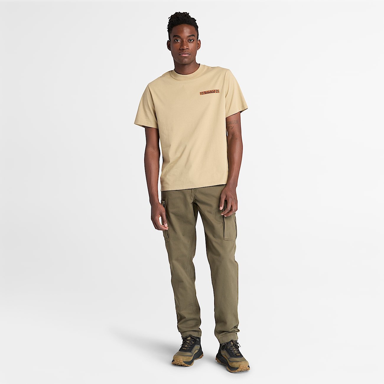 This twill cargo pant has a relaxed tapered fit, multiple pockets, a contrast internal waistband, and a 100% organically grown cotton composition.